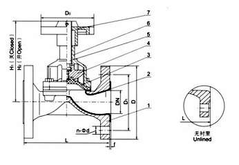 部件列表:1.阀体 2.阀体衬里 3.隔膜 4.阀瓣 5.阀杆 6.阀盖 7、手轮